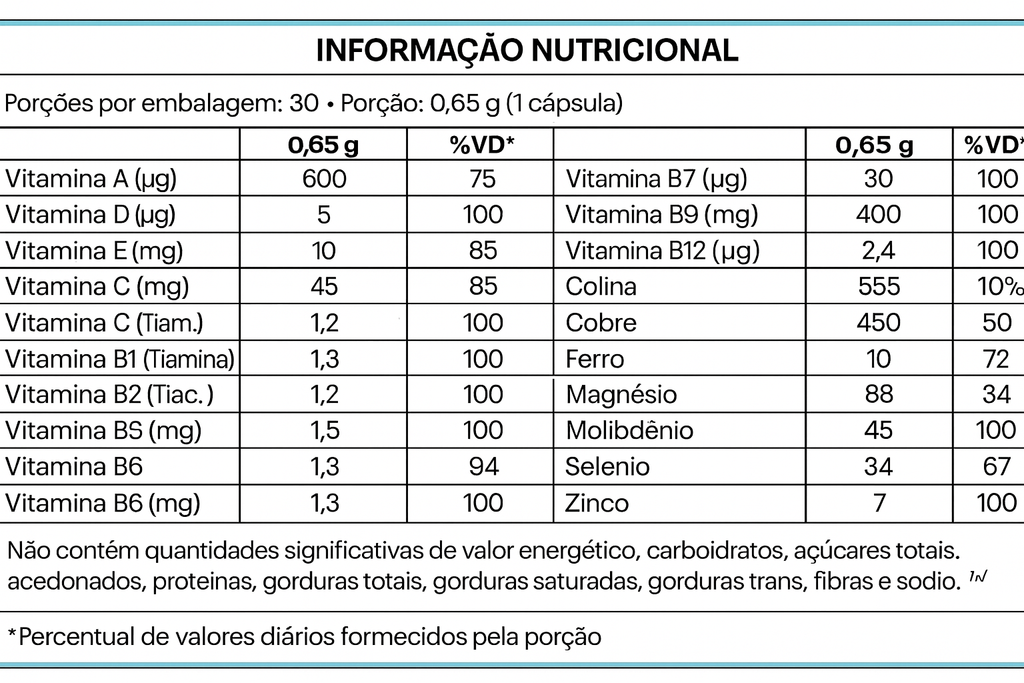 Ele reúne uma combinação equilibrada de 23 vitaminas e minerais, oferecendo praticidade em apenas 2 cápsulas por dia.